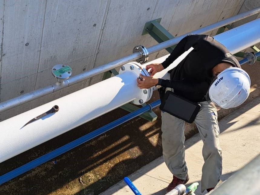 配管の採寸を行います。メジャーやレーザースケールを使用したりして、配管の長さの直線やカーブの部分も含め調査をします。